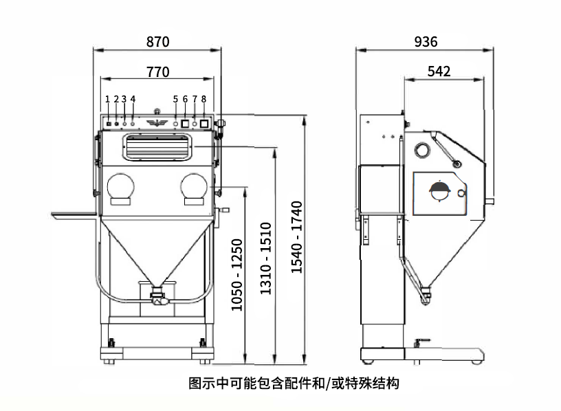 側(cè)面加料門 , 寬360mm x高290mm , 左向和右向 , 配雙重垂直百葉簾。用來(lái)輕松地給較長(zhǎng)工件噴細(xì)砂(可選配)